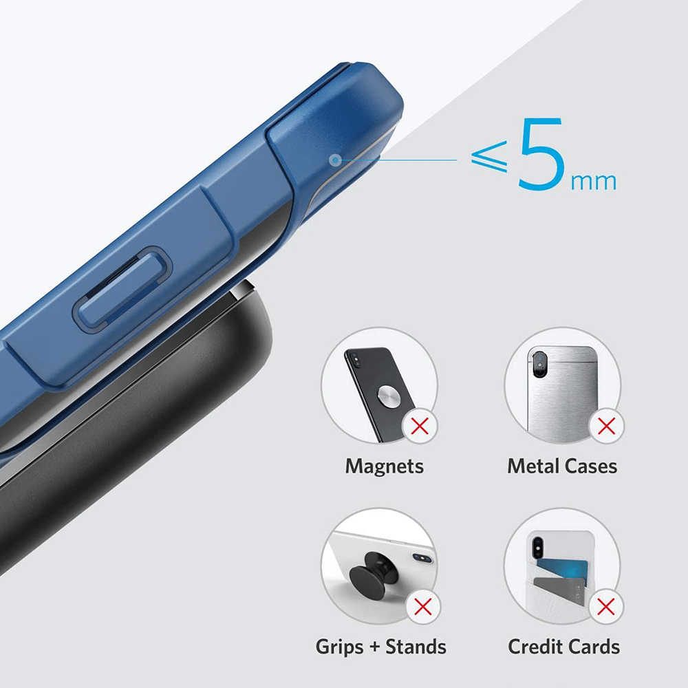 - Case Friendly: Don’t fumble with your phone case. PowerWave charges directly through protective cases. Rubber/plastic/TPU cases less than 5 mm thick only. Magnetic and metal attachments or cards will prevent charging.