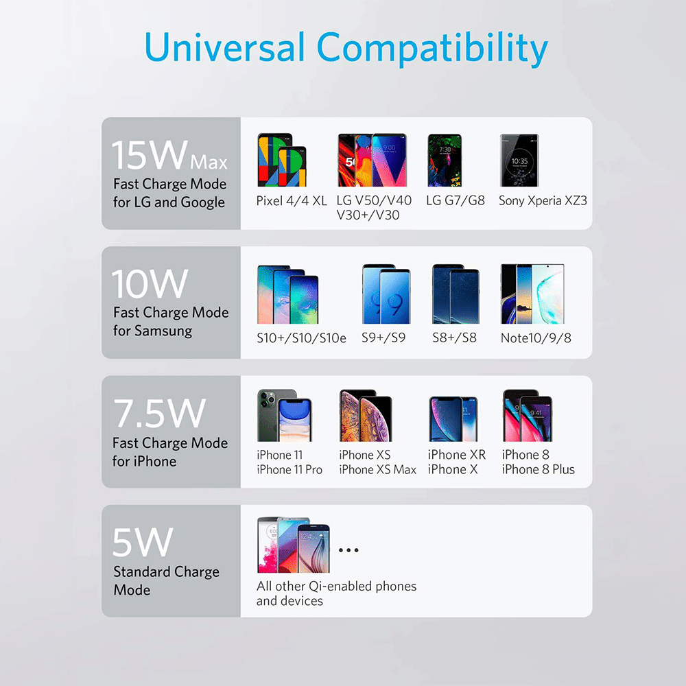 - One for All: Works at high speed with most wirelessly-charged phones, including the latest iPhone and other flagship phones. Quick Charge 3.0 wall charger required (not included).