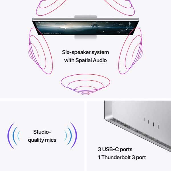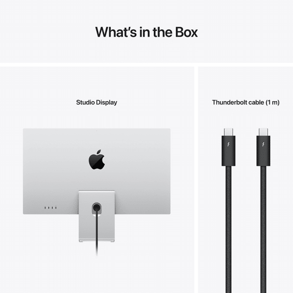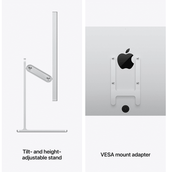 | Size and Weight | Studio Display with tilt-adjustable stand Height: 18.8 inches (47.8 cm) Width: 24.5 inches (62.3 cm) Depth: 6.6 inches (16.8 cm) Weight: 13.9 pounds (6.3 kg) |