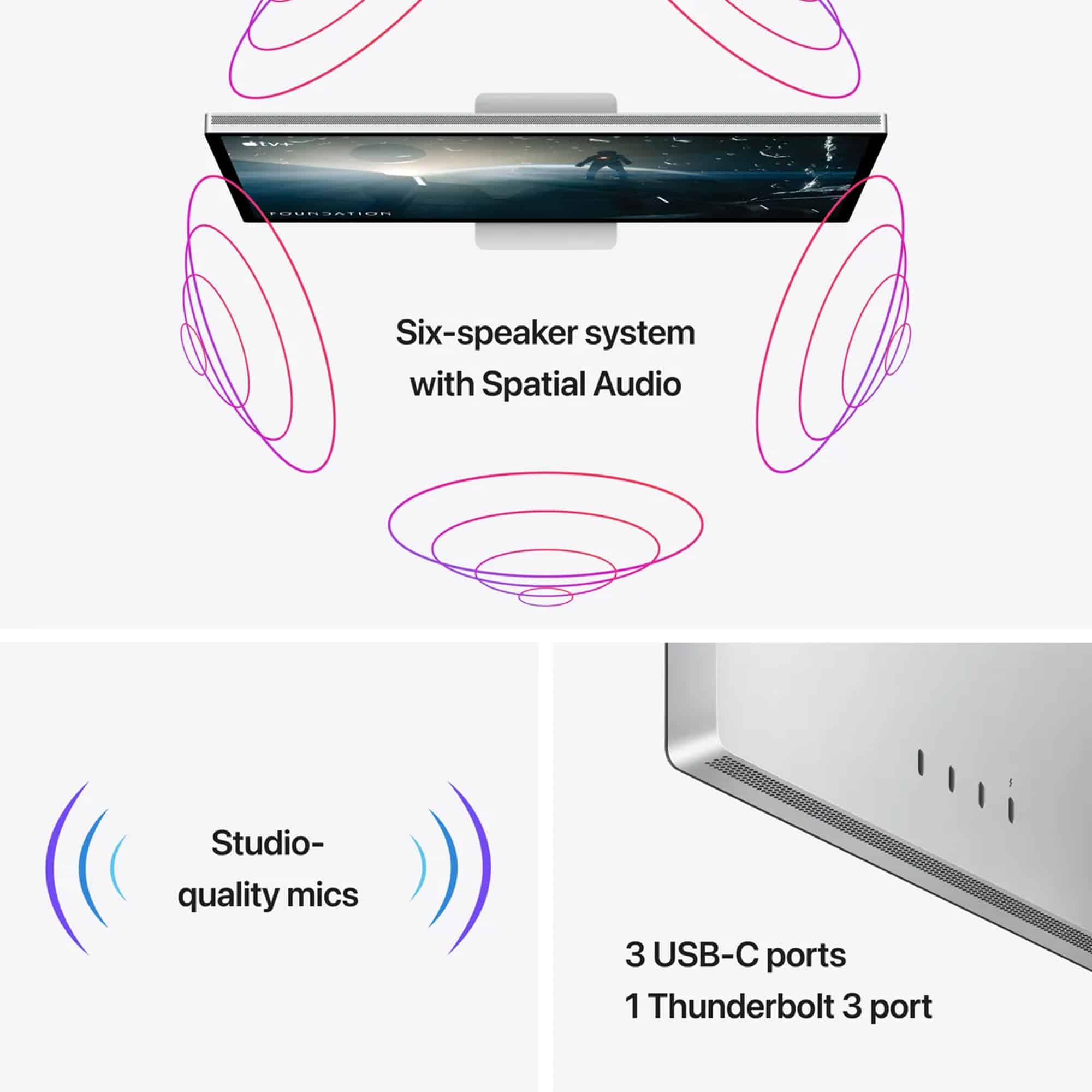 | Compatibility | Mac Studio (2022) 16-inch MacBook Pro (2019 or later) 14-inch MacBook Pro (2021) 13-inch MacBook Pro (2016 or later) 15-inch MacBook Pro (2016 or later) MacBook Air (2018 or later) Mac mini (2018 or later) Mac Pro (2019 or later) 24‑inch iMac (2021) 27-inch iMac (2017 or later) 21.5-inch iMac (2017 or later) iMac Pro (2017) Studio Display is compatible with the following iPad models with iPadOS 15.4 or later:iPad Pro 12.9-inch (3rd generation or later) iPad Pro 11-inch iPad Air (5th generation) |