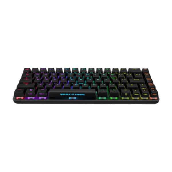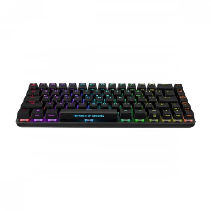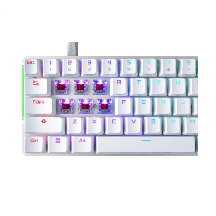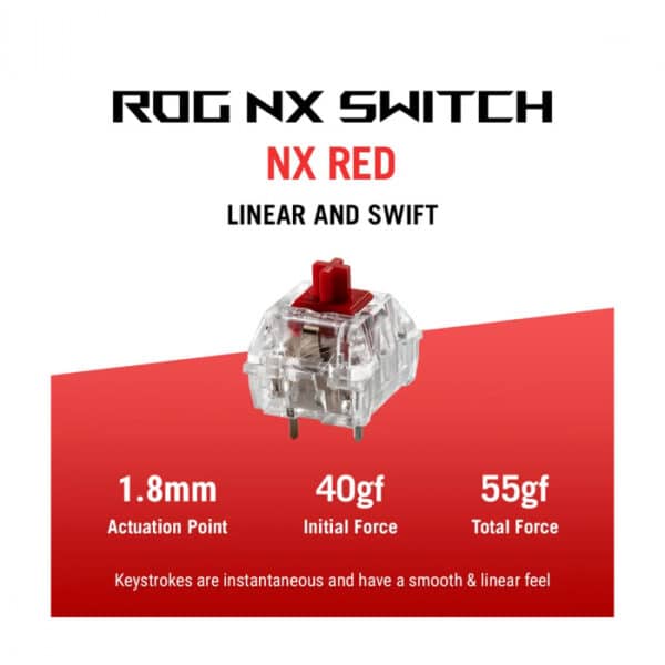 • ROG NX mechanical switches: Lubricated stem and housing for smoother clicks and to eliminate bouncing noise respectively, fast actuation and ROG-tuned force curves for great, consistent keystrokes