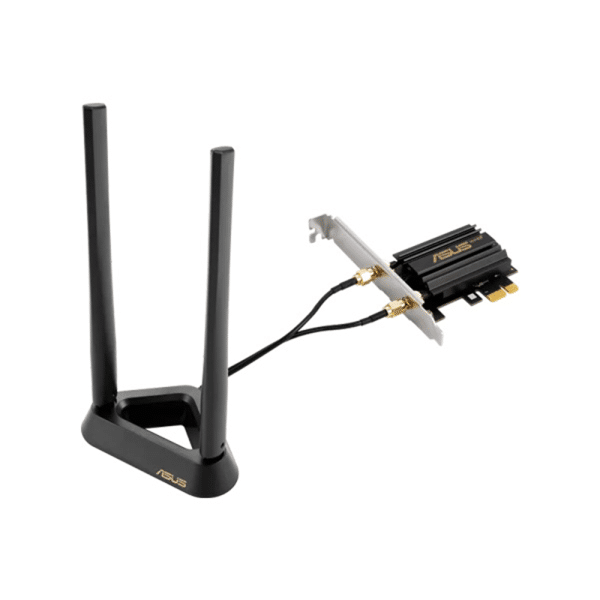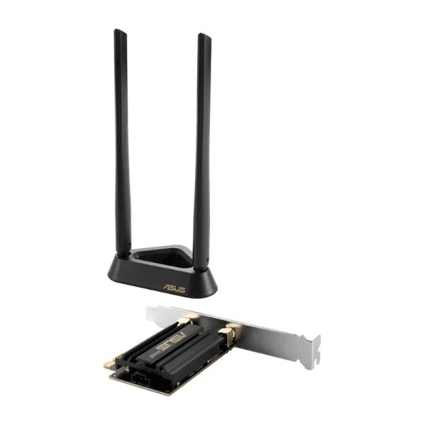 The WiFi 6E Leader ASUS provides a total solution for the latest WiFi 6E standard, from routers to wireless PCIe® cards. With carefully designed engineering and supporting software, the ASUS WiFi 6E total solution ensures optimized capabilities and performance. * PCE-AXE59BT only supports PCI-Express x1 standard, please install the adapter in PCI-e x1 slot. Least Congested WiFi ASUS PCE-AXE59BT is a WiFi 6E PCIe® card that allows your PC to connect to a WiFi 6E router via the dedicated 6 GHz band. This means it will not compete for bandwidth with non-WiFi 6E devices. The 6 GHz band provides up to seven extra 160 MHz channels, providing more bandwidth, more flexibility, and less congestion. Ultrafast WiFi 6E Desktop Upgrade With WiFi 6E's 6 GHz technology and wide 160 MHz channels, PCE-AXE59BT delivers wireless speeds that are up to 4.6X faster* than WiFi 5 devices, making it perfect for even the most bandwidth-demanding tasks. *Comparison based on a 2x2 160 MHz WiFi 6E PCIe card versus a 2x2 80 MHz WiFi 5 PCIe card Low Latency. Fast WiFi. PCE-AXE59BT adds powerful OFDMA and MU-MIMO functionality your PC. Instead of making your PC wait in turn with other connected devices when transferring wireless data to the router, these technologies allow each device's data to be sent simultaneously. The result is increased network efficiency and lower latency for maximum WiFi performance. Instant Bluetooth® Upgrade Slot PCE-AXE59BT into your PC for an instant upgrade to the latest Bluetooth® 5.2 technology, and enjoy up to 2X-faster transmit speeds and 4X-greater range compared to Bluetooth 4.2. Interference is also reduced compared to Bluetooth 5.0. Your PC will enjoy fast and stable connections to all your wireless peripherals. Better WiFi with Optimal Antenna Placement PCE-AXE59BT comes with an external transceiver that allows you to position the antennas outside of your PC chassis, and adjust their angle for less interference and optimal signal reception. The magnetized base allows even more flexible placement. Enhanced Network Security with WPA3 PCE-AXE59BT uses the WPA3 WiFi security protocol, providing your PC with an extra layer of protection against external attacks to give you added peace of mind.Specifications:-