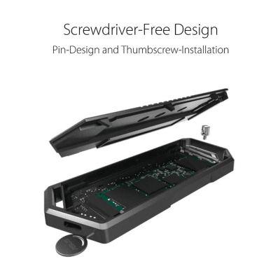 Innovative screwdriver-free installationROG Strix Arion features a pin-design and thumbscrew-installation system that makes it easy to mount your SSD into the enclosure. No screwdriver is required. |
