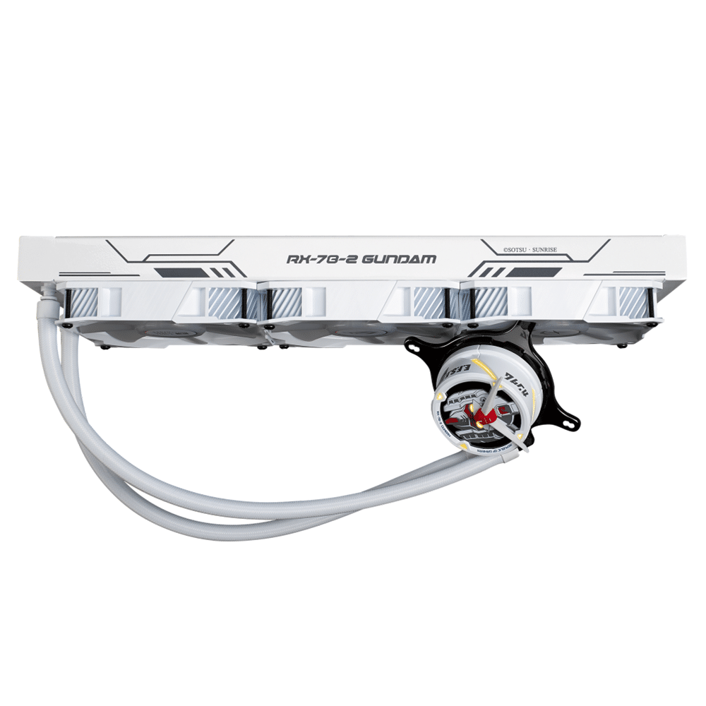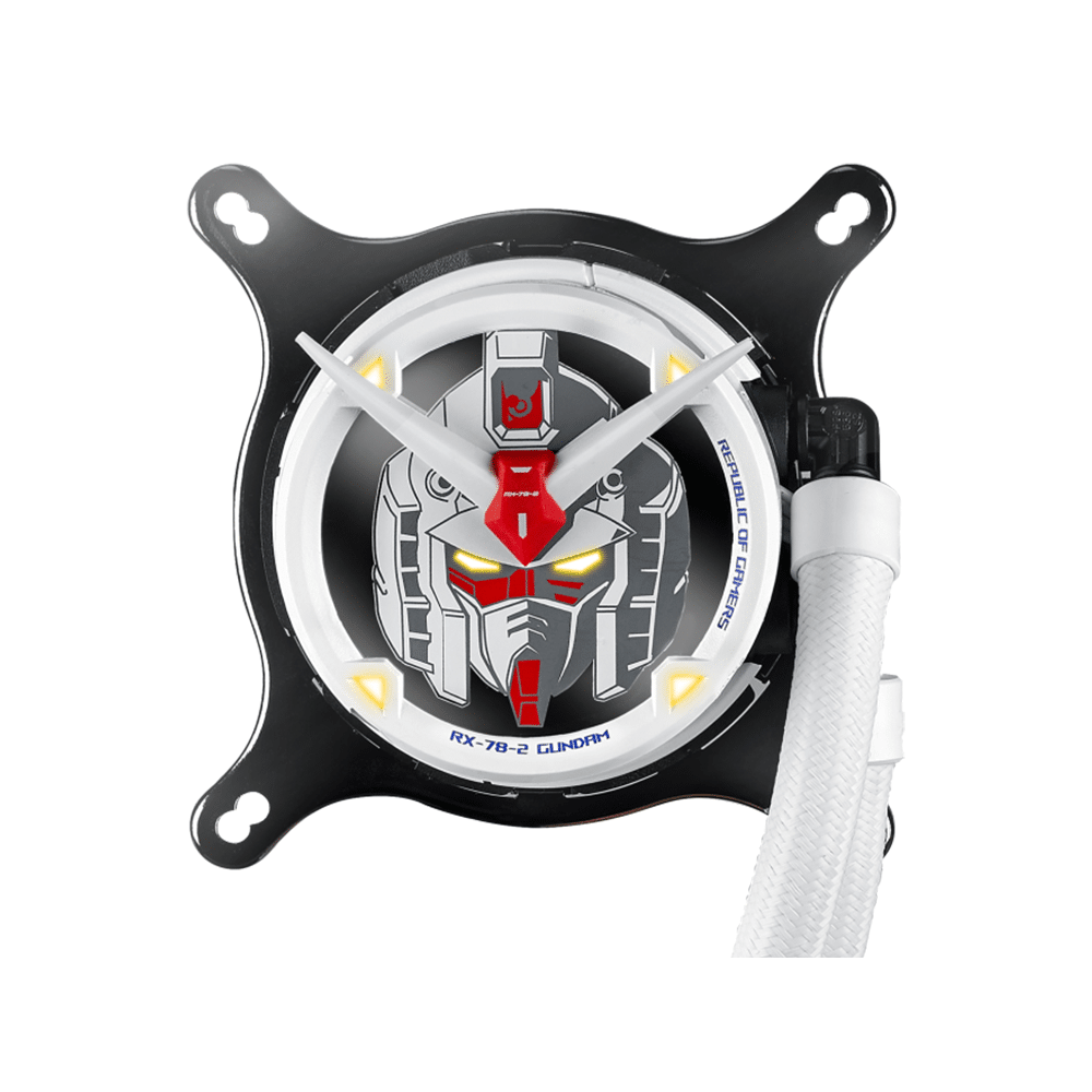 With its striking white finish, the RX78-2 Gundam head on the pump cover and signature design decals along the radiator and pump, ROG Strix LC 360 RGB Gundam Edition delivers a visual impact that makes it the ideal centerpiece of your Gundam build.