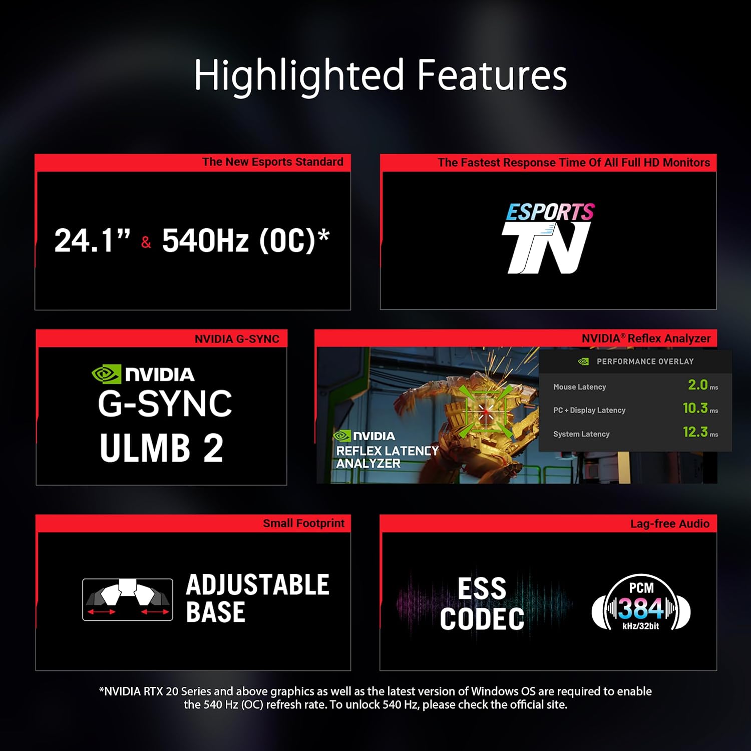 | Special Features | 24.1-inch FHD (1920 x 1080) Esports-TN (E-TN) gaming monitor with 540 Hz (OC)* refresh rate is designed for professional gamers World’s fastest TN panel; E-TN panel technology is approximately 50% more responsive than traditional TN panels available Adjustable base with retractable claws ensures a small footprint NVIDIA® G-SYNC Ultra Low Motion Blur 2 (ULMB 2) provides enhanced motion blur reduction, bringing over 2000 Hz of effective motion clarity NVIDIA® Reflex Analyzer offers accurate measurements of system latency |