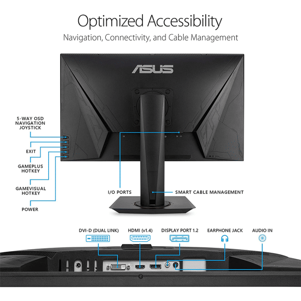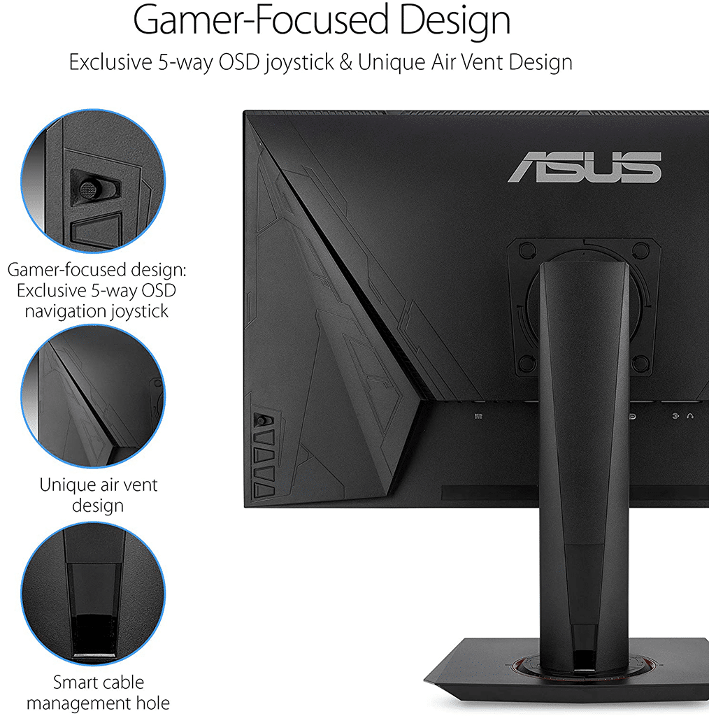 An exclusive 5-way OSD navigation joystick makes adjusting screen features much easier. A unique air vent design helps with keeping your monitor running with minimal noise while maintaining the gamer A smart cable management design feature found on the stand of VG278QR helps you organize and hide cables to keep your gaming area tidy.