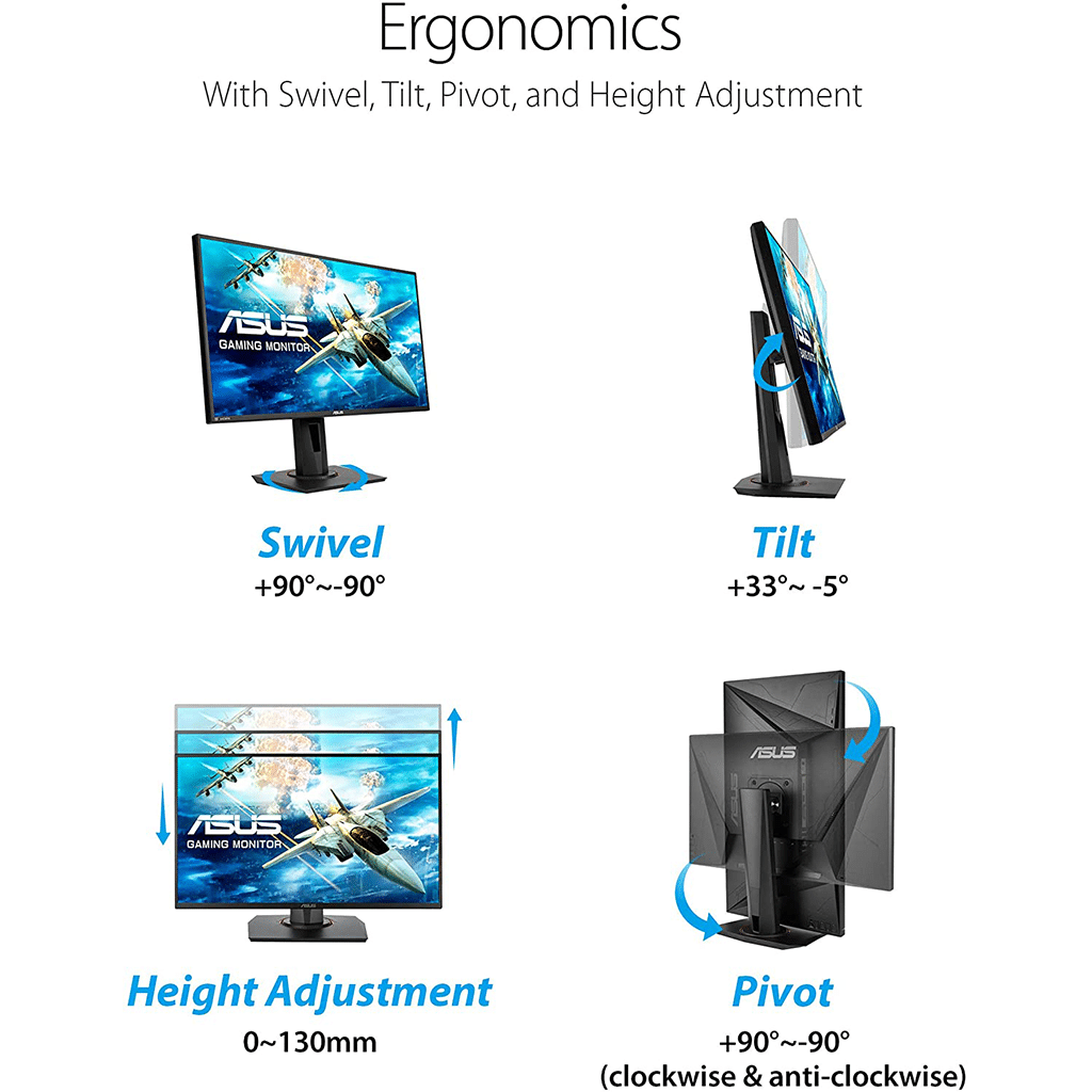- Marathon ready with ASUS Eye Care technology to minimize eye fatigue and an ergonomic stand with full height/tilt/swivel/pivot adjustments to accommodate any desk