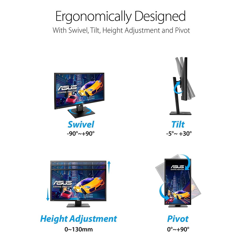 Ergonomic designASUS VP28UQGL is specially designed for long marathon gaming sessions. Its ergonomically-designed stand lets you adjust the monitor so you always find your ideal viewing position.