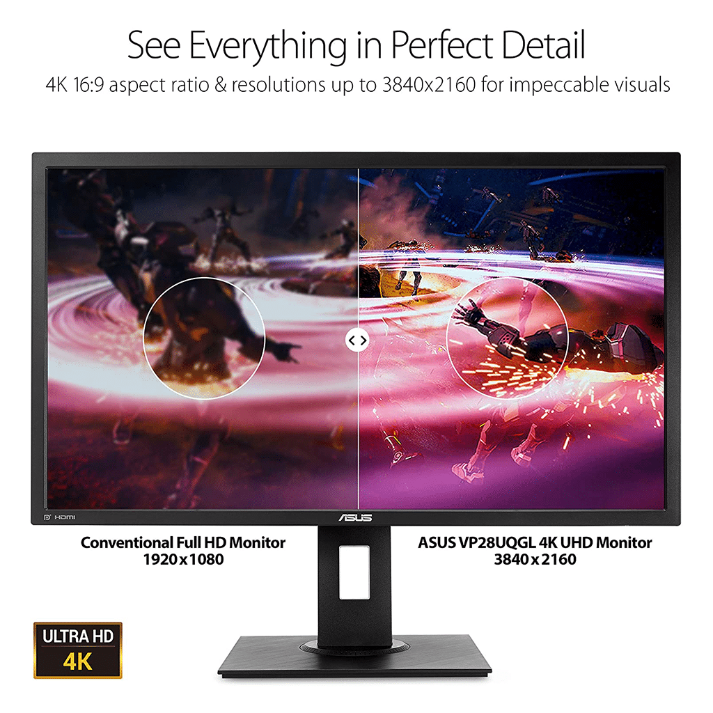 - 28” 4K UHD (3840×2160) with 60Hz refresh rate and 1ms (GTG) response time Plus Adaptive Sync/AMD Free Sync for immersive, crisp visuals