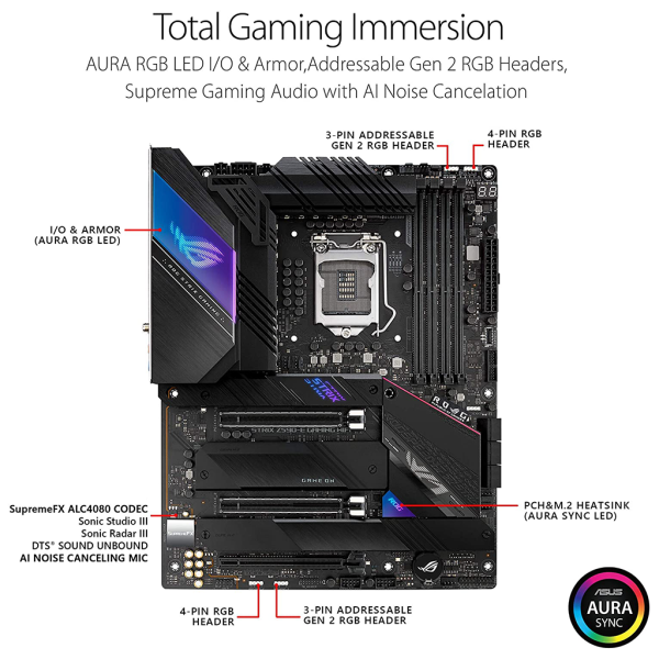 UNDENIABLY ROG STRIXThe eye-catching ROG Strix Z590-E Gaming WiFi embodies the ROG spirit while boldly looking to the future. Design touches suchas a glitch-effect ROG logo, etched cybertext markings and embedded Aura RGB LEDs give it a bold aesthetic while clearly paying respect to deep ROG roots. |