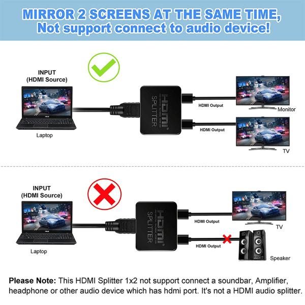 - 1×2 HDMI SPLITTRE DUPLICATE/MIRROR ONLY – Powered HDMI Splitter can distribute one HDMI input signal to two HDMI displays, transmit video and audio simultaneously, no loss, no lag (NOTE: just Duplicate/Mirror screens,