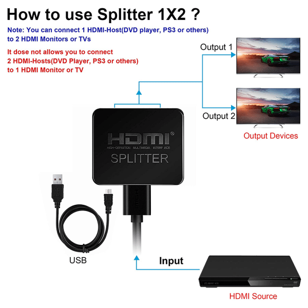 - PORTABLE – 4K HDMI Splitter 1 in 2 out, size: 2.5×2.1×0.5 inches/ 6.3X5.3X1.2 cm ( L X W X H ), easy to use and carry, travel friendly. USB cable included(it needs to be powered via usb), no need external driver, safety and Eco-friendly (Seller recommend 25ft long hdmi cable(max))