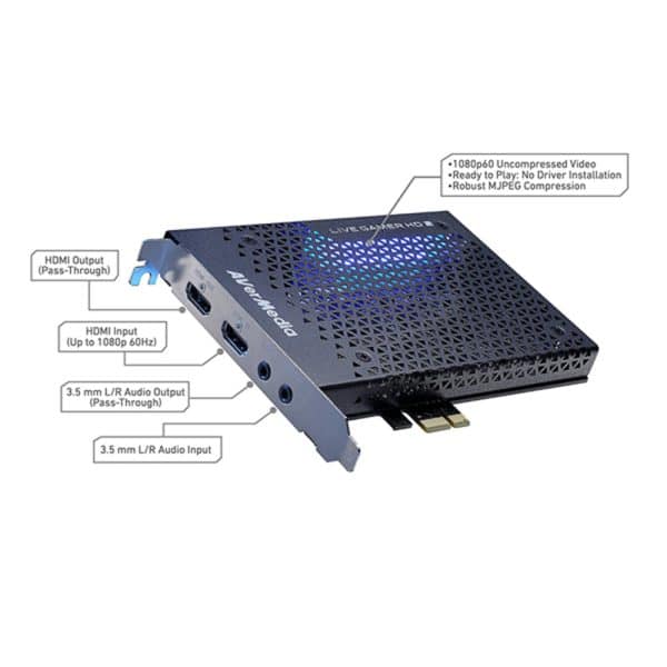 Interface: PCI Express x1 Gen 2 Input: HDMI*, 3.5 mm audio Output: HDMI (pass-through), 3.5 mm audio Maximum Capture Resolution: 1080p60 Bundled Software: RECentral 3 Compatible Software: UVC/UAC compliant software such as XSplit or OBS Dimensions: 125 x 151 x 21.5 mm Weight: 145 g * LGHD2 does not support viewing/recording/streaming of HDCP protected signals