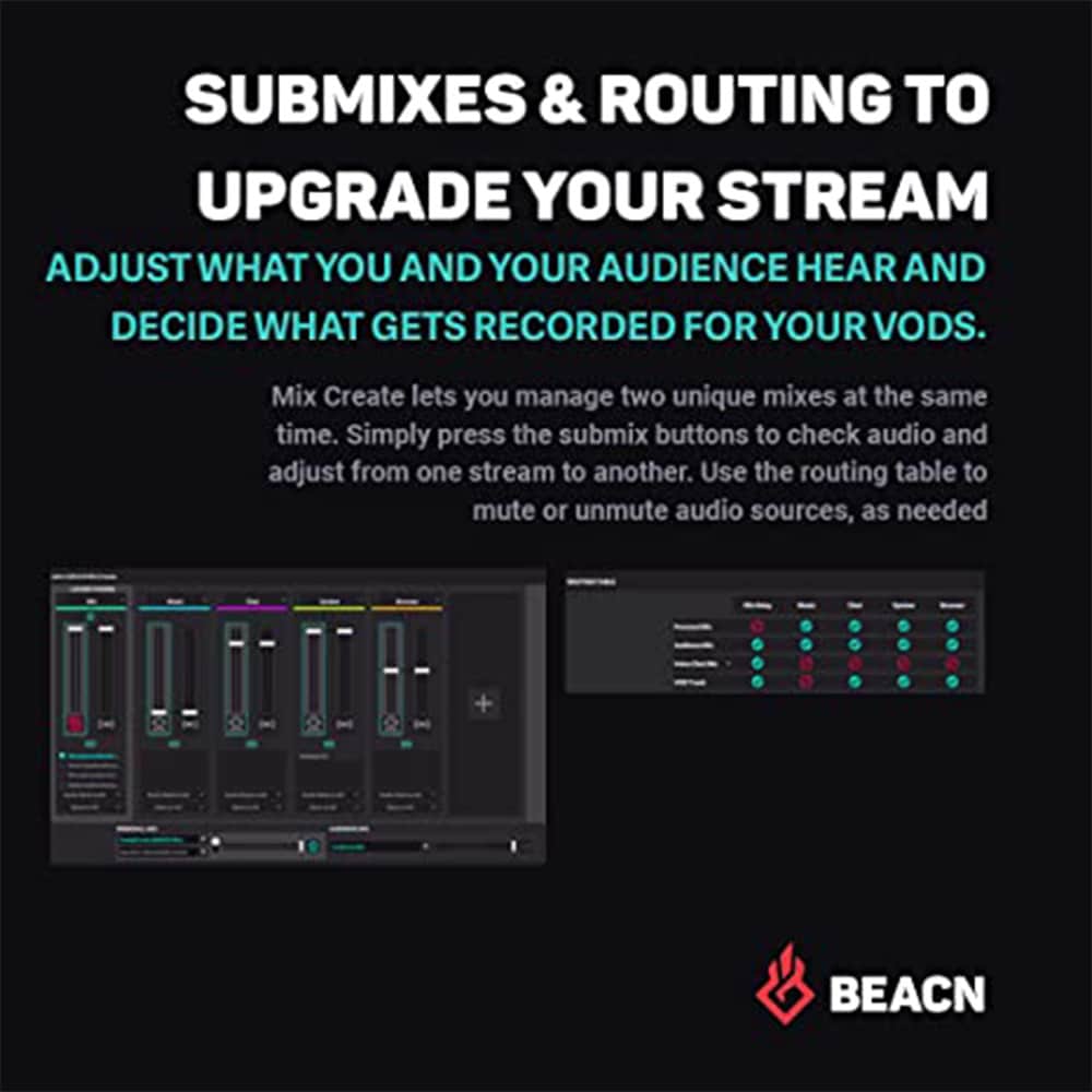 - COMPLETE YOUR COMPUTER ACCESSORIES - Mix Create's audio interface for PC is paired with smooth push-button encoders that allow precise volume control and quick muting. BEACN Mix Create gives you the ability to easily manage an unlimited number of sources, letting you focus on your audience, game, or content creation.
