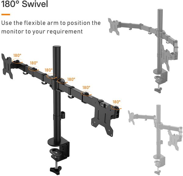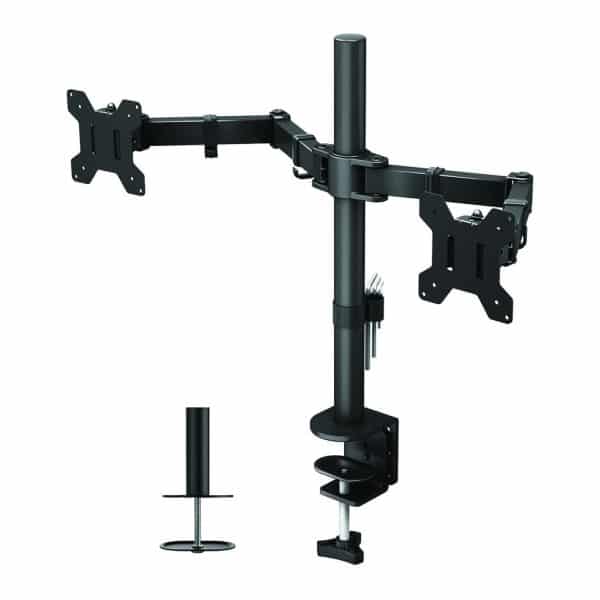 - Strong steel double arm desk mount – mounts two screens side by side to conveniently free up desk space. Holds two 13”-27” TV or monitors with a maximum load capacity of 10 kg for each arm