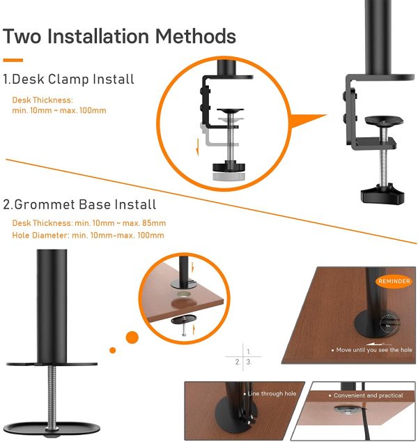 The sturdy grommet mounting base frees up valuable desk space and makes your workstation spacious. The grommet base works for desks thickness from 10mm to 85mm, with the hole diameter ranging from min.10mm-max.100mm. |