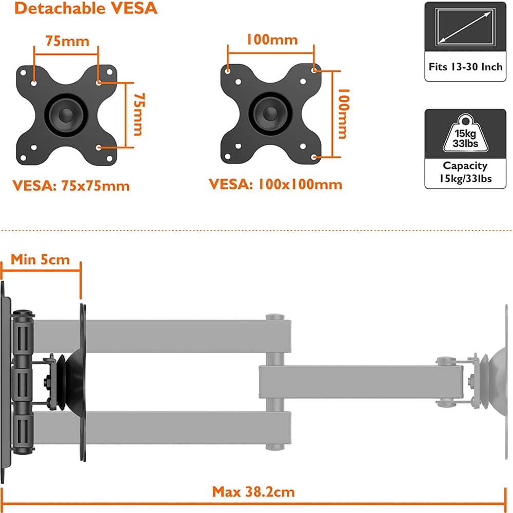 • Compatible with 13″ to 30″ LED/LCD TVs with VESA size of 75x75mm (3″x3″) or 100x100mm (4″x4″); maximum load capacity of 15 kg (please confirm your TV’s VESA mounting standards and screen size before purchasing)