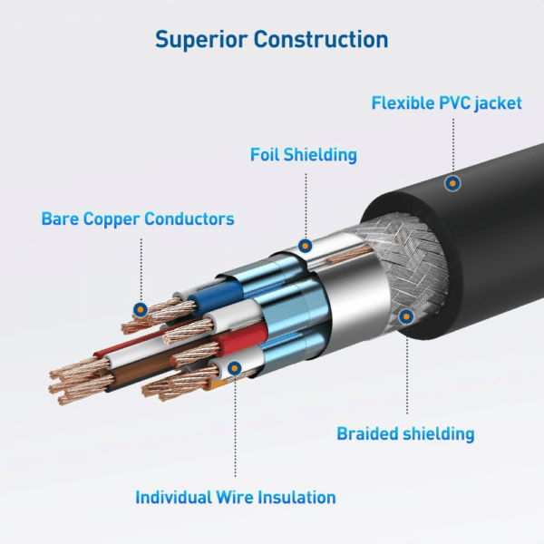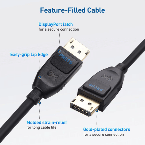 - Superior construction of this DisplayPort 2.1 cable includes gold-plated connectors for maximum durability, a locking latch to ensure a secure connection, and shielding to ensure error-free video transmission