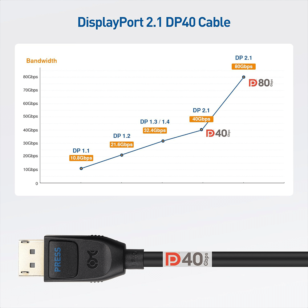- Step into the future of DisplayPort connectivity with this DP40 cable; Display Port 2.1 cable supports up to 40Gbps data transmission for 8K 120Hz or 4K 144Hz video