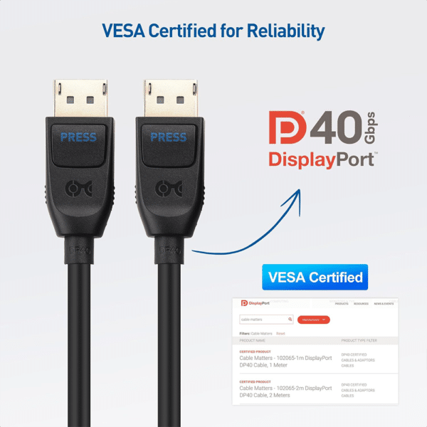 VESA Certified :This cable has been tested and certified to meet VESA standards / Certified to DP40 standards for a maximum bandwidth of 40Gbps