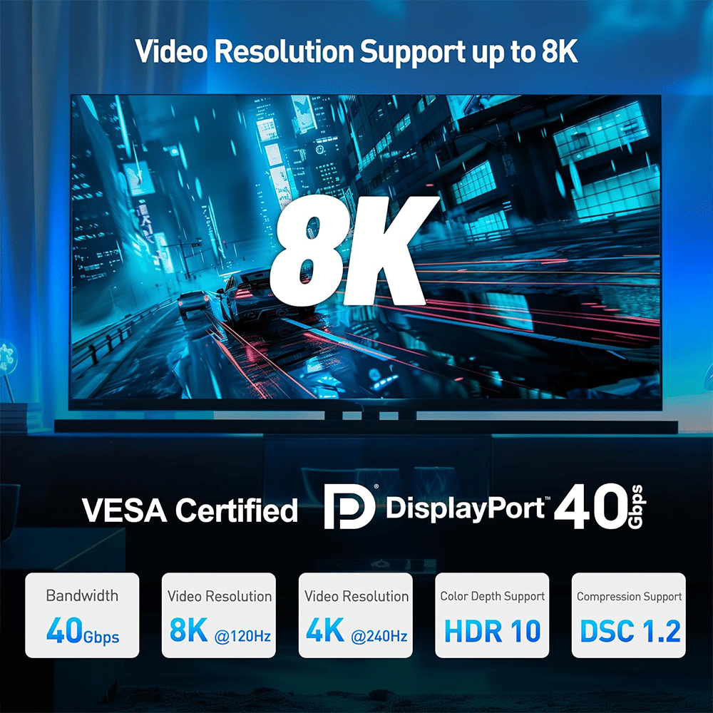 Advanced DisplayPort Features: This DisplayPort 2.1 cable supports features including G-Sync and FreeSync for tear-free gaming / Enjoy ultra high resolution video for the ultimate gaming experience
