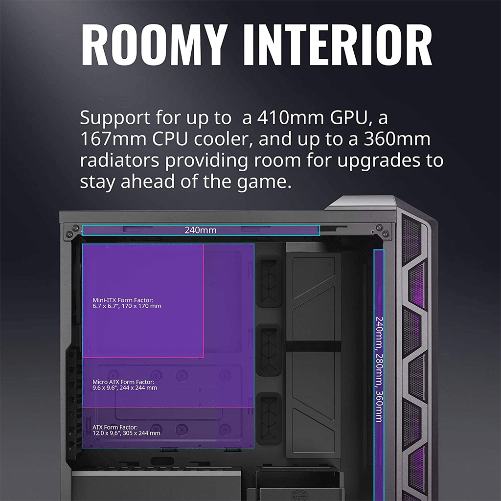 Roomy InteriorSupport for up to a 410mm GPU, a 167mm CPU cooler, and up to a 360mm radiators providing room for upgrades to stay ahead of the game. |