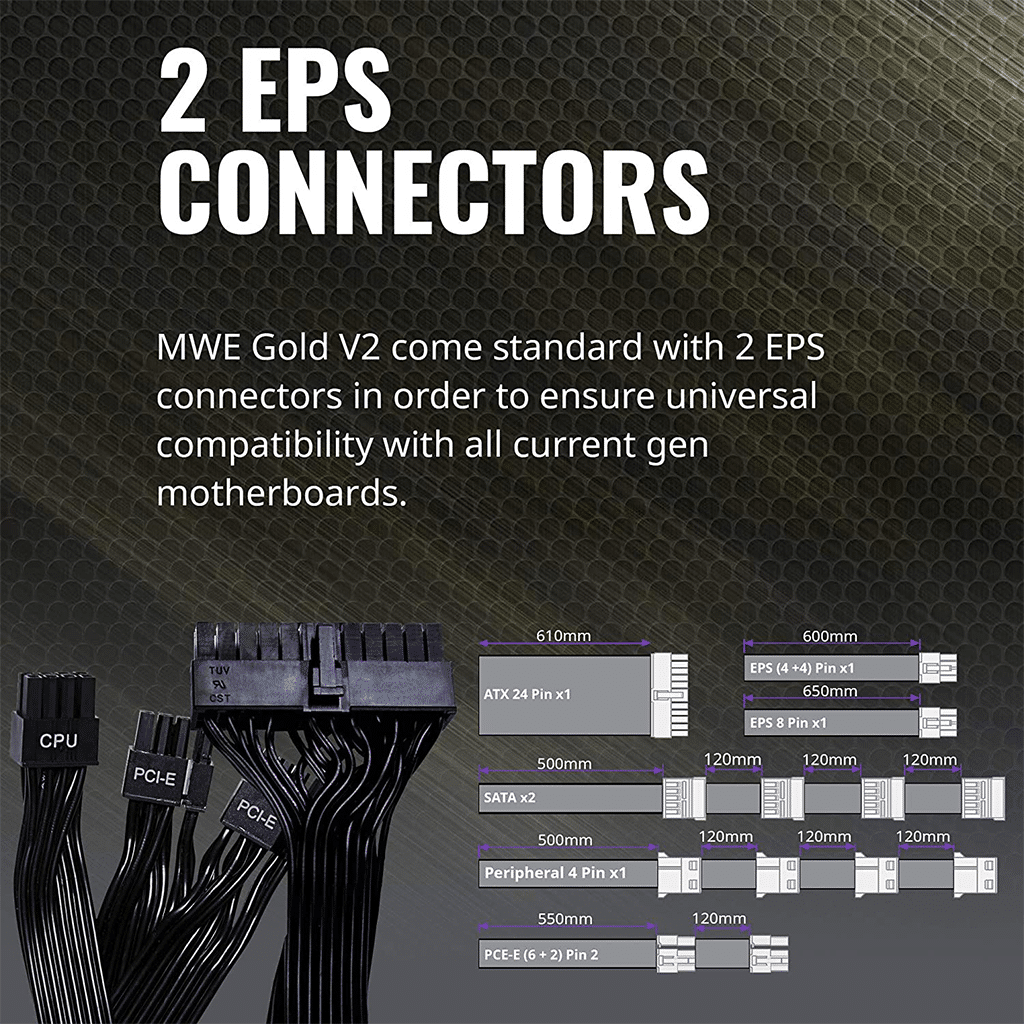 2 EPS ConnectorsMWE Gold V2 comes standard with 2 EPS connectors to ensure universal compatibility with all current gen motherboards. |