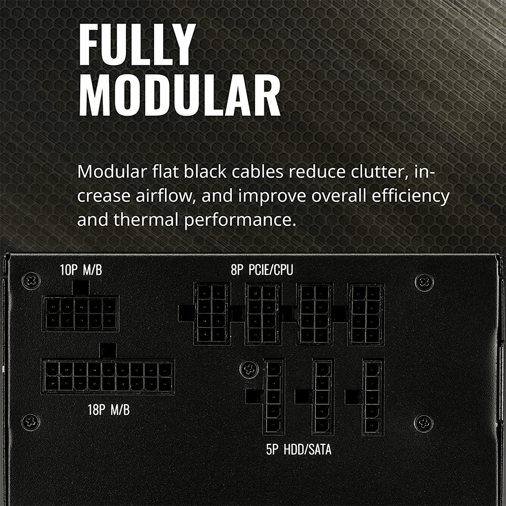 - FullY Modular: Modular flat black cables reduce clutter, increase airflow, and improve overall efficiency and thermal performance.