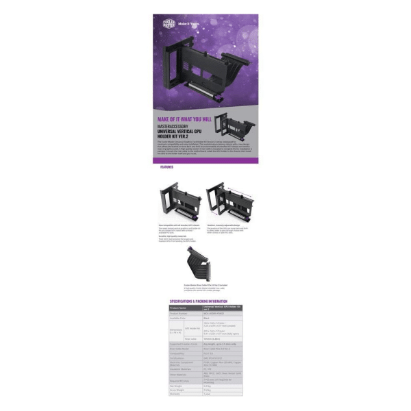 - Showcase your graphics card – The vertical graphics card holder Kit allows vertical installation of a GPU to better show off the visual design of the GPU and its cooler.