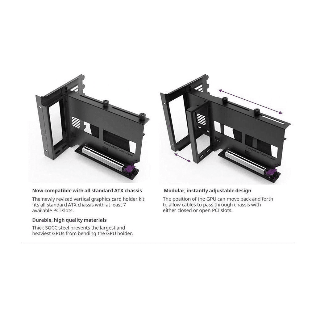- Compatible with all standard ATX chassis – The newly revised vertical graphics card holder kit fits all standard ATX chassis with at least 7 available PCI slots.