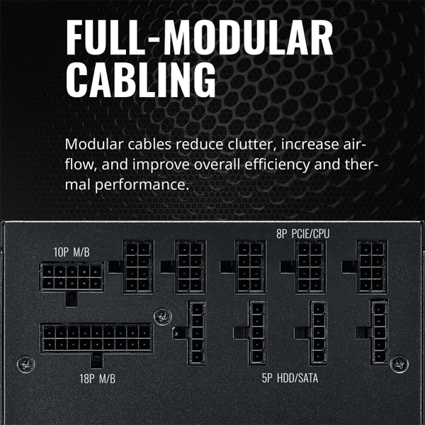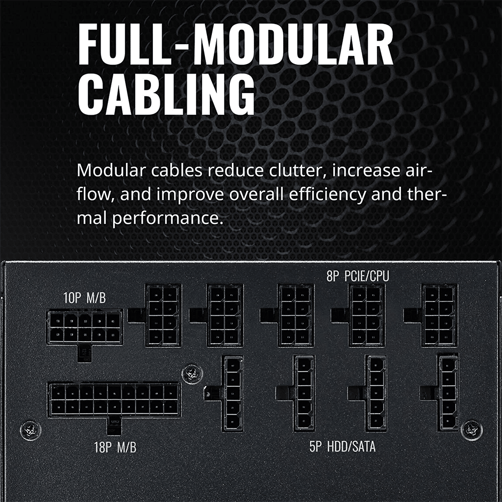 - Full-Modular Cabling : Modular cables reduce clutter, increase airflow, and improve overall efficiency and thermal performance.