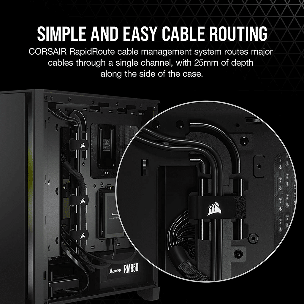 - The CORSAIR RapidRoute cable management system makes it simple and fast to route your major cables through a single channel, with a roomy 25mm of space behind the motherboard for all of your cables.