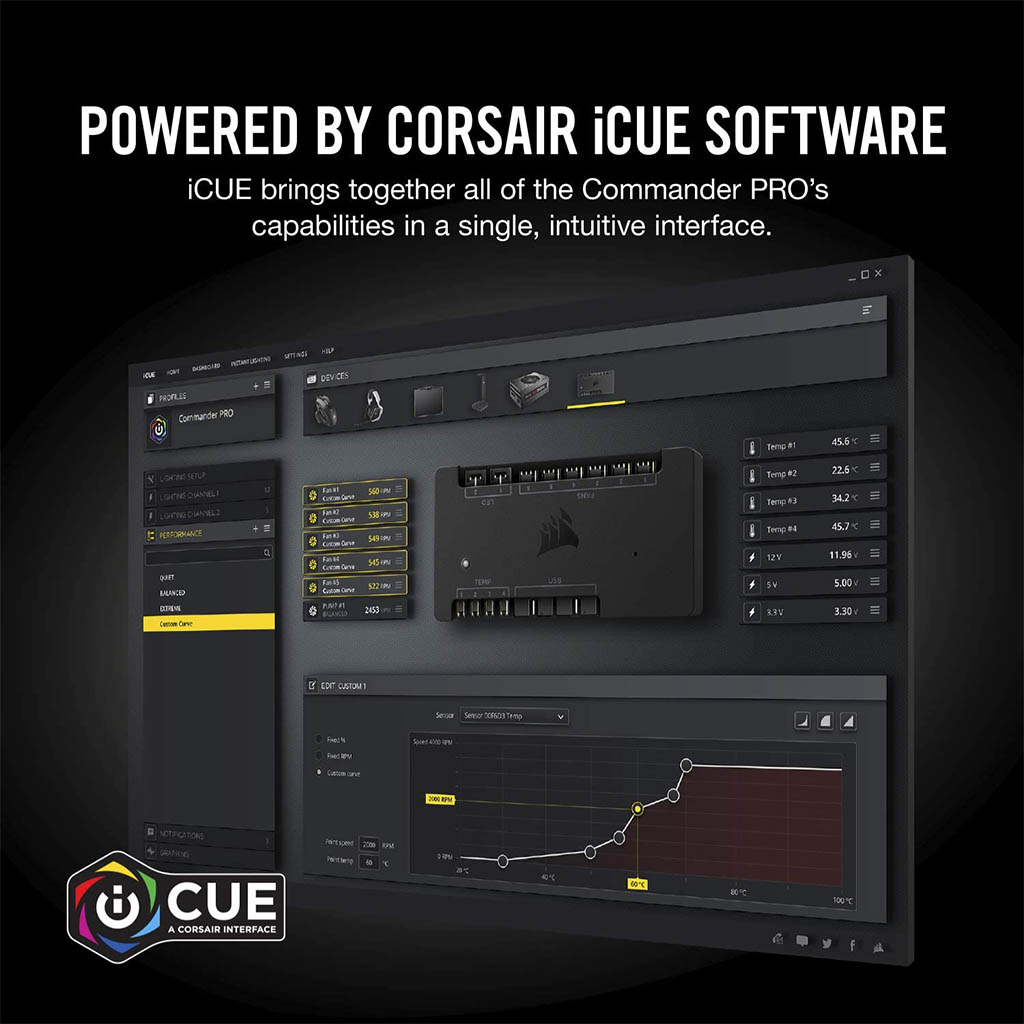 The CORSAIR Commander PRO grants superior and accurate hardware control with a compact, all-in-one device. Fully compatible with CORSAIR LINK devices, it supports up to six fan connectors, four temperature inputs, two RGB LED channels and multiple USB devices through two internal USB 2.0 headers.
