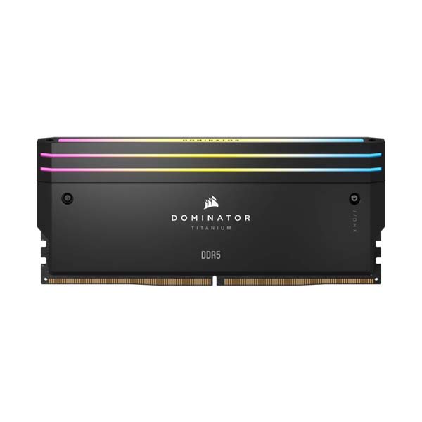 CORSAIR DOMINATOR TITANIUM RGB DDR5 Memory combines clean, refined styling with superior die-cast aluminum construction and advanced lighting design for a premium memory experience. Optimized for Intel® systems. BEYOND THE CUTTING EDGE OF PERFORMANCE Push your system to new heights with the latest DDR5 memory, unlocking even faster frequencies, greater capacities, and better performance. POWERFUL CORSAIR iCUE SOFTWARE iCUE software unlocks dynamic RGB lighting control, synchronized across your entire CORSAIR setup, with real-time temperature, voltage, and frequency monitoring. YOUR MEMORY, YOUR WAY Change your memory's style and cooling capabilities with official accessories or 3D print your own top bars for a totally unique aesthetic. CUSTOMIZABLE INTEL XMP 3.0 PROFILES Set your memory to its rated speed in seconds, via a single setting. Customize and save your own XMP profiles via iCUE to maximize performance by application or task for greater efficiency. WIDE COMPATIBILITY Optimized for the latest Intel processors and DDR5 motherboards.Specifications