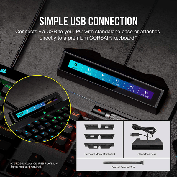 iCUE NEXUS can be plugged into the included standalone base for freedom of desktop positioning or can be attached directly to select CORSAIR keyboards for a more integrated experience.