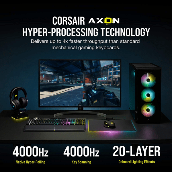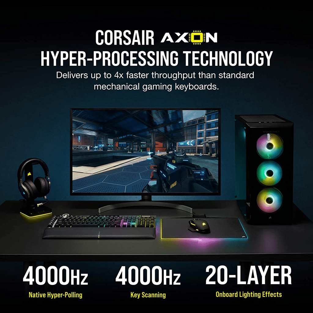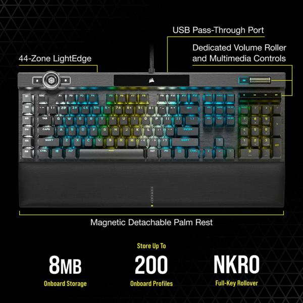 Exclusive CORSAIR OPX optical-mechanical keyswitches offer hyper-fast input with just 1.0mm actuation distance and smooth linear travel for top-tier gaming performance.