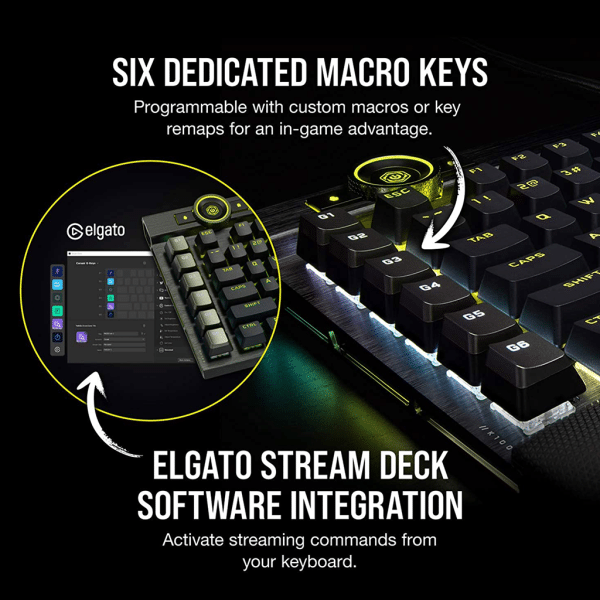 Gain an in-game advantage with six dedicated macro keys, fully programmable for complex macros and key remaps in iCUE software, or program special streaming commands through Elgato Stream Deck software.