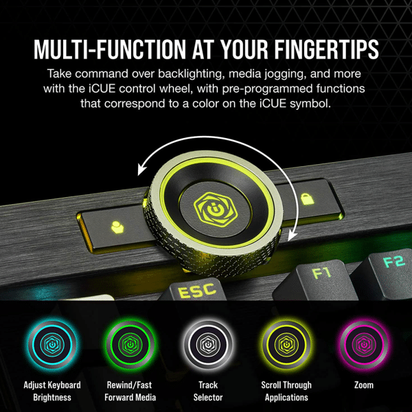 Take command over backlighting, media jogging, and more with a multi-function iCUE control wheel, fully programmable to perform custom actions in games and applications.