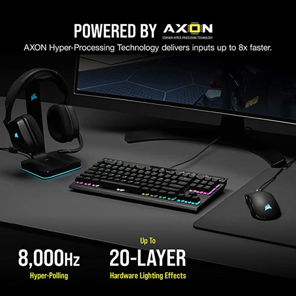 • CORSAIR AXON hyper-processing technology transmits your inputs to your PC up to 8x faster than conventional gaming keyboards with 8,000Hz hyper-polling.