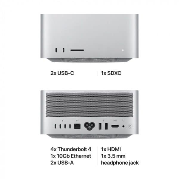 | Connections and Expansion | Four Thunderbolt 4 ports with support for: Thunderbolt 4 (up to 40Gb/s) DisplayPort USB 4 (up to 40Gb/s) USB 3.1 Gen 2 (up to 10Gb/s) Two USB-A ports (up to 5Gb/s) HDMI port 10Gb Ethernet 3.5 mm headphone jack On front (M1 Max): Two USB-C ports (up to 10Gb/s) SDXC card slot (UHS-II) |