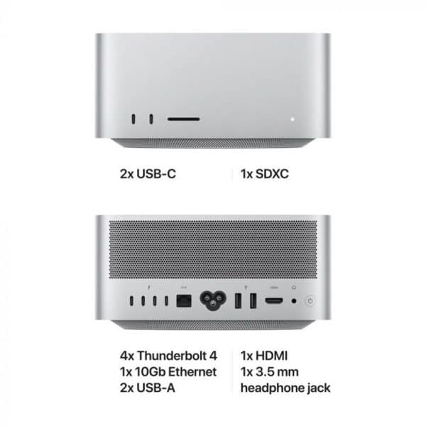 | Connections and Expansion | Four Thunderbolt 4 ports with support for: Thunderbolt 4 (up to 40Gb/s) DisplayPort USB 4 (up to 40Gb/s) USB 3.1 Gen 2 (up to 10Gb/s) Two USB-A ports (up to 5Gb/s) HDMI port 10Gb Ethernet 3.5 mm headphone jack On front (M1 Max): Two USB-C ports (up to 10Gb/s) SDXC card slot (UHS-II) |