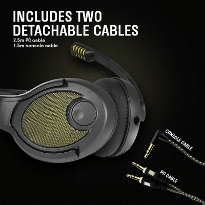 Included: 2 removable cables (PC and console), 2 pairs of earpads (mesh knit and velour), Drawstring travel pouch