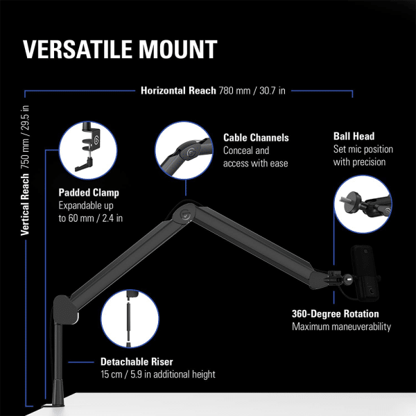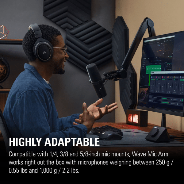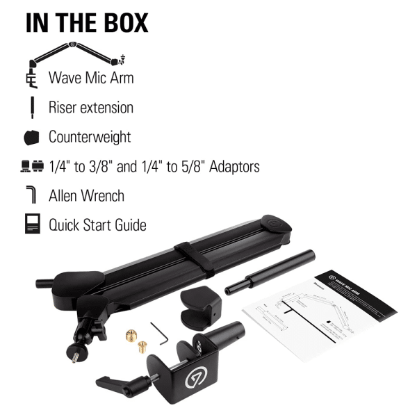 - Custom counterweight adapts arm tension to mic weight