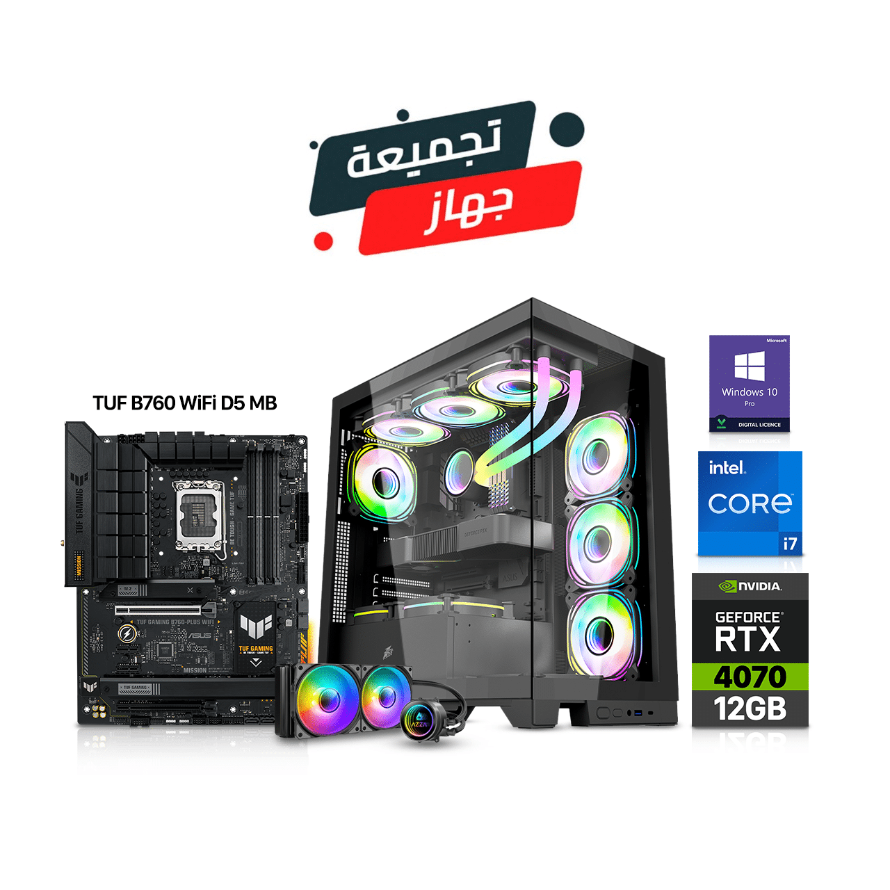 Gaming PC i7-12700F – Asus TUF B760 WiFi D5 MB – 32GB DDR5 (5200) RAM – RTX 4070 – 1TB NVMe – 750W Gold PSU – AZZA L240 Liquid-Cooler – Mid-Tower Case with 4x Fans (Black) Win 10 Pro