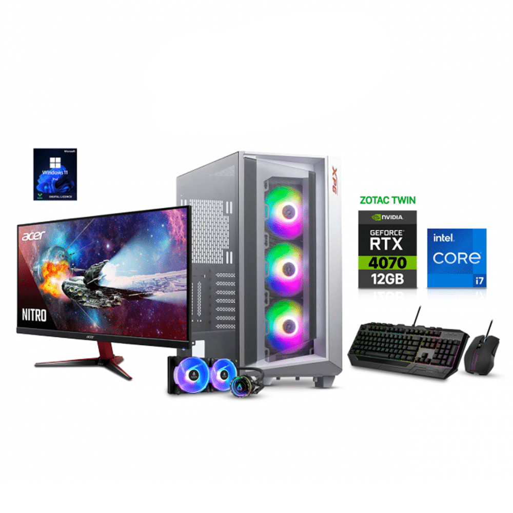 Home Products Computers system Gaming PC Gaming PC i7-13700, TUF Gaming B760M-PLUS WIFI D5, 32GB RAM DDR5 (5200), 1TB SSD NVME, ZOTAC TWIN RTX 4070 12GB VGA, 850 Watt GOLD PSU, AZZA L240 Liquid Cooler, XPG Cruiser Case, Win 11 Pro, Acer Nitro VG271 Monitor, Cooler Master Devastator 3 RGB Combo