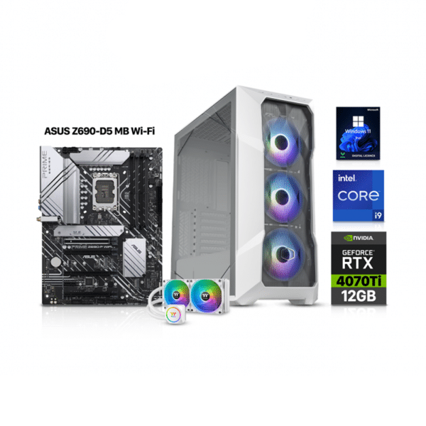 Gaming PC i9-12900k Processor, ASUS Z690-D5 MB Wi-Fi, 32GB RAM DDR5 (5200), RTX 4070TI VGA 12GB, 2TB SSD NVME, Thermaltake L240 Liquid Cooler White, 850 WATT GOLD PSU, Cooler Master MasterBox TD500 Mid Tower Case, Win 11 Pro License