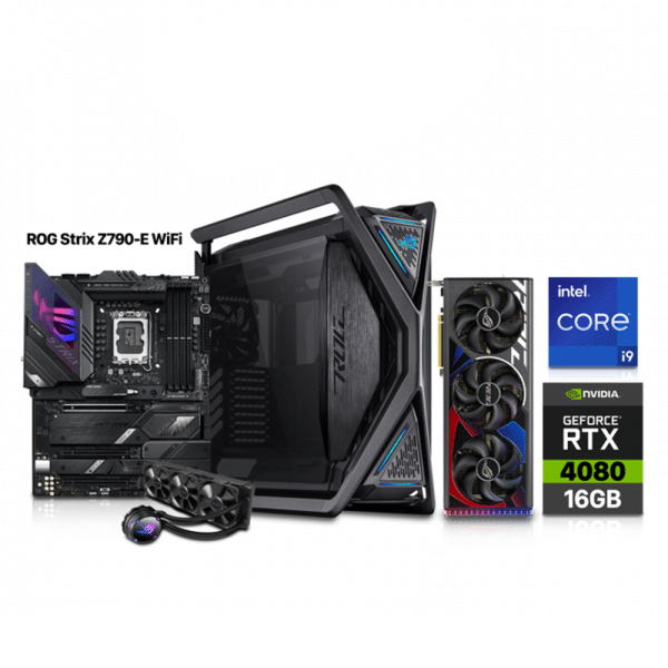 Gaming PC i9-13900K, Asus ROG Strix Z790-E MB, 32GB RAM DDR5 (5600), 2TB NVMe SSD Renegade (7300), Asus ROG Strix RTX 4080 16GB VGA, Asus ROG Strix LC360 Liquid-Cooler, Asus ROG Thor 1200 Watt PSU, Asus ROG Hyperion GR701 Case, Win 11 Pro Licence