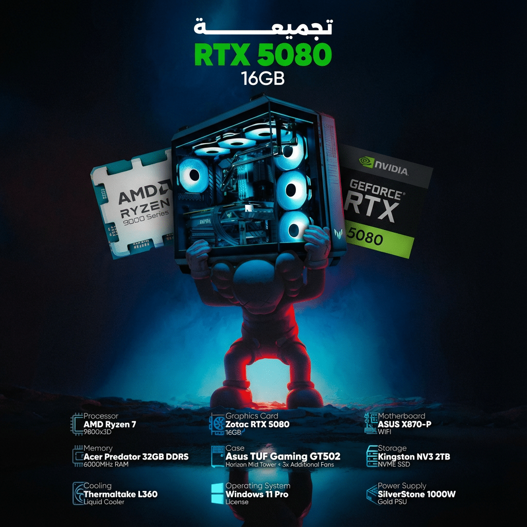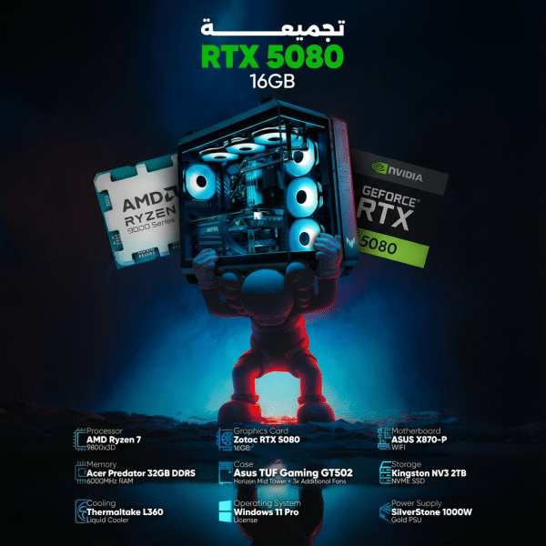 Gaming PC – Ryzen 7 9800X3D, ASUS X870-P WiFi DDR5, 32GB DDR5 6000, 2TB NVMe SSD, Zotac RTX 5080 16GB, SilverStone 1000W Gold PSU, Thermaltake L360 Liquid Cooler, ASUS TUF Horizon 502 Case, Windows 11 Pro