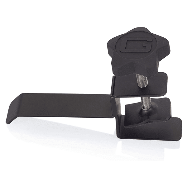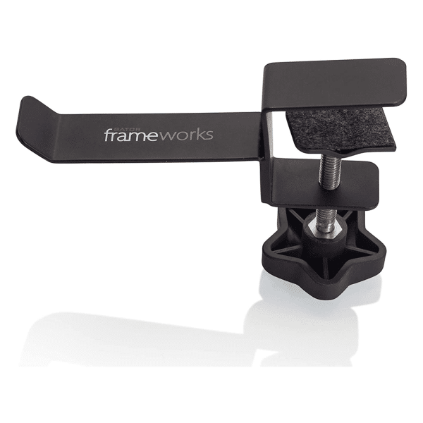 Gator Cases Frameworks Headphone Hanger For Desks (GFW-HP-HANGERDESK). Designed for recording and project studios, broadcast houses, touring companies, or anyone looking to keep their headphones readily available and out of harm's way, the Gator Cases Frameworks Headphone Hanger for Desks reduces the risk of damage due to leaving headphones improperly stored on floors, desks, drawers, or other temporary surfaces. The clamp utilizes a table edge, accommodating a thickness of up to 1.5". The hanger can also work alternatively as a cable hanger.