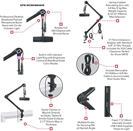 - Professional Desktop Broadcast/Podcast Microphone Boom Stand with On-Air Indicator Light